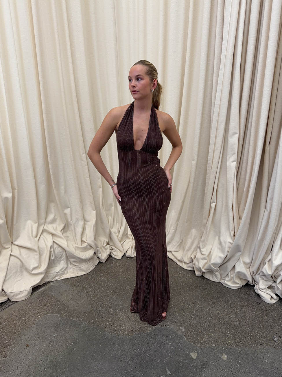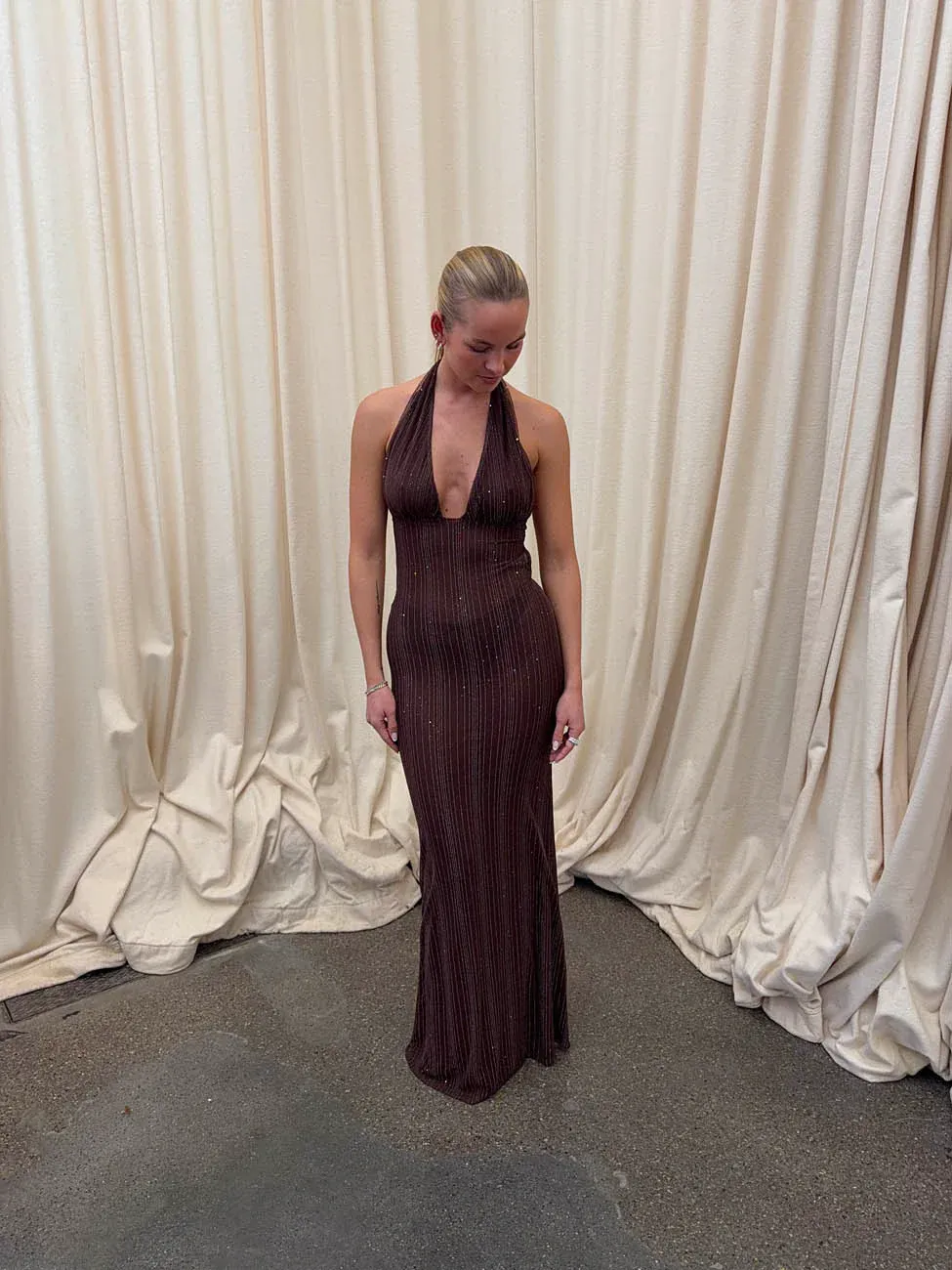 This elegant brown maxi dress is the perfect choice for festive occasions. The dress is made from a soft, stretchy material that drapes beautifully over the body and ensures maximum comfort. The subtle striped glitter pattern adds a delicate, star-like shine that catches the light beautifully as you move.
