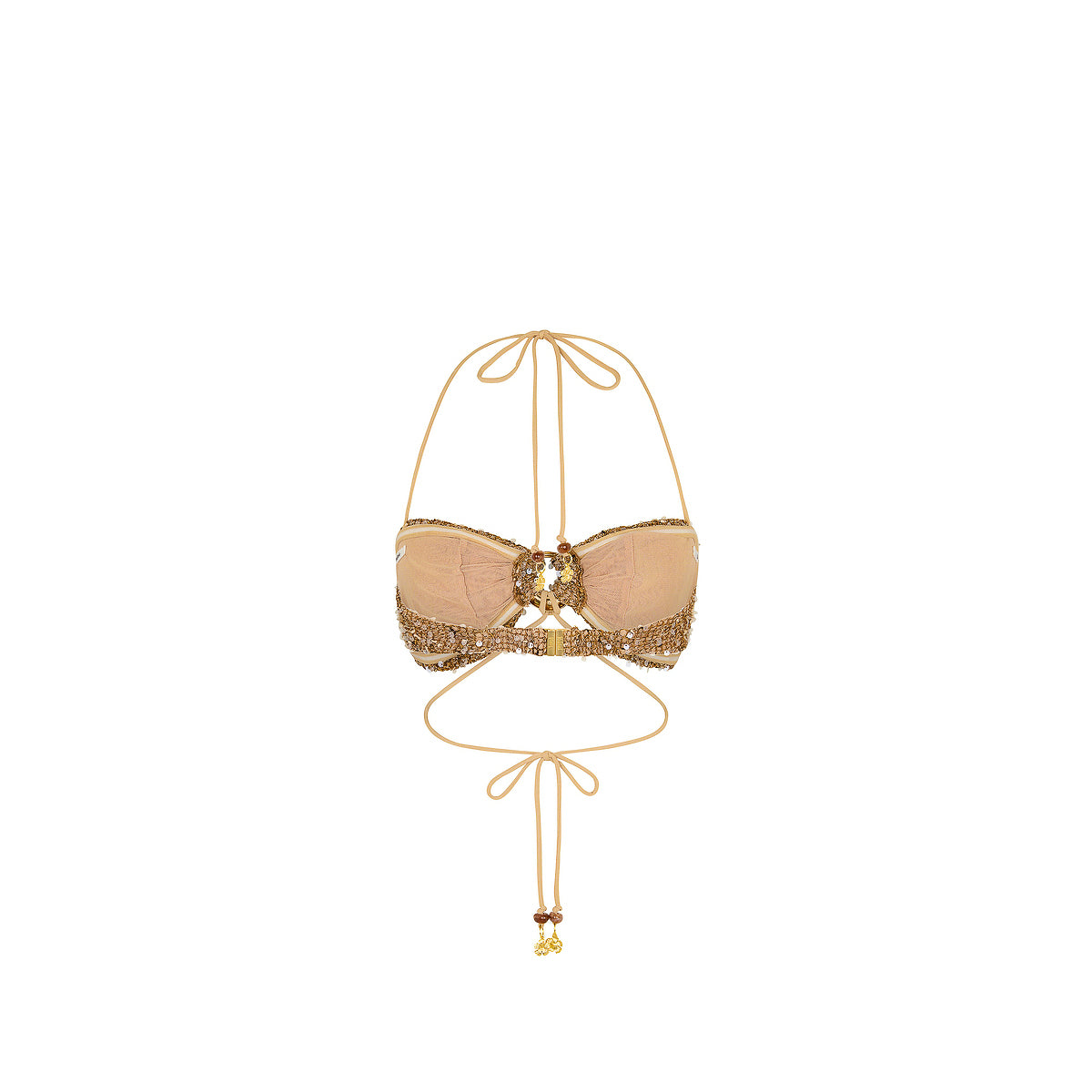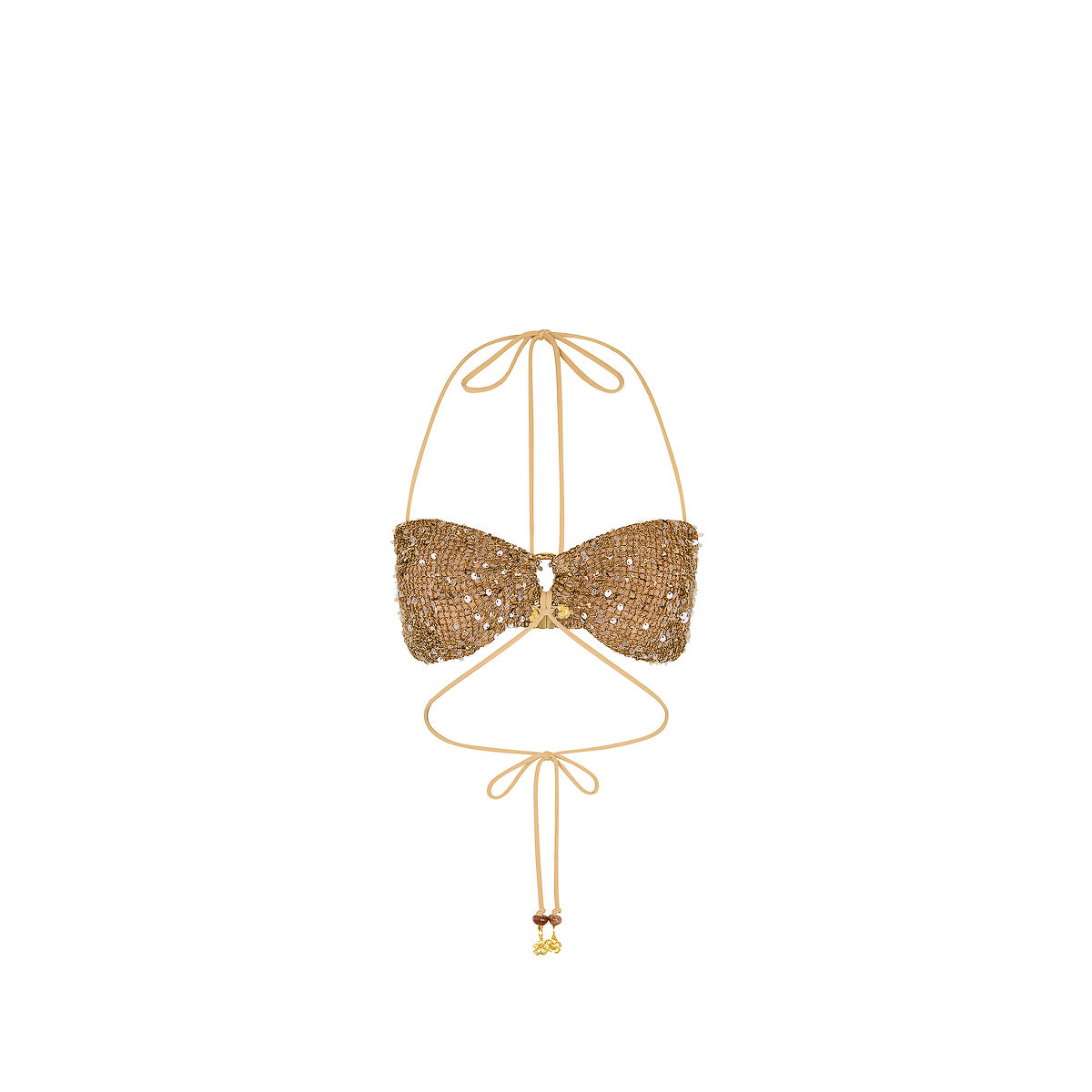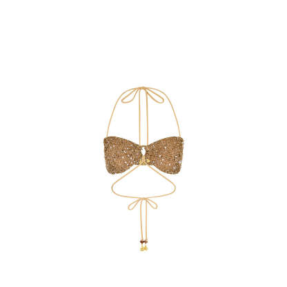 The Strappy Ring Tie Crop Top adds shine to any beach-to-bar look, featuring a bralette silhouette with a hammered centre-front ring, contrast binding, and delicate tie straps. Pairs perfectly with the Strappy Bias Maxi Skirt.