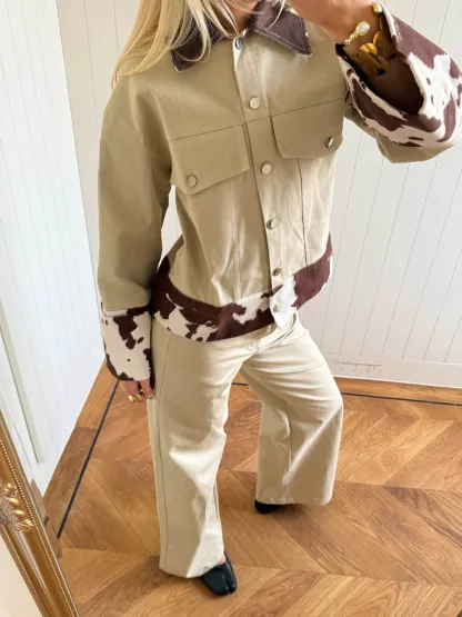 This denim jacket combines classic denim with a cow print. The jacket has chest pockets and a front button closure, while the collar, cuffs, and hem are made in a contrasting cow print. The perfect statement jacket for anyone who wants a denim jacket with a twist.