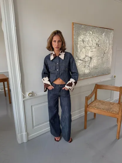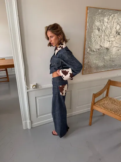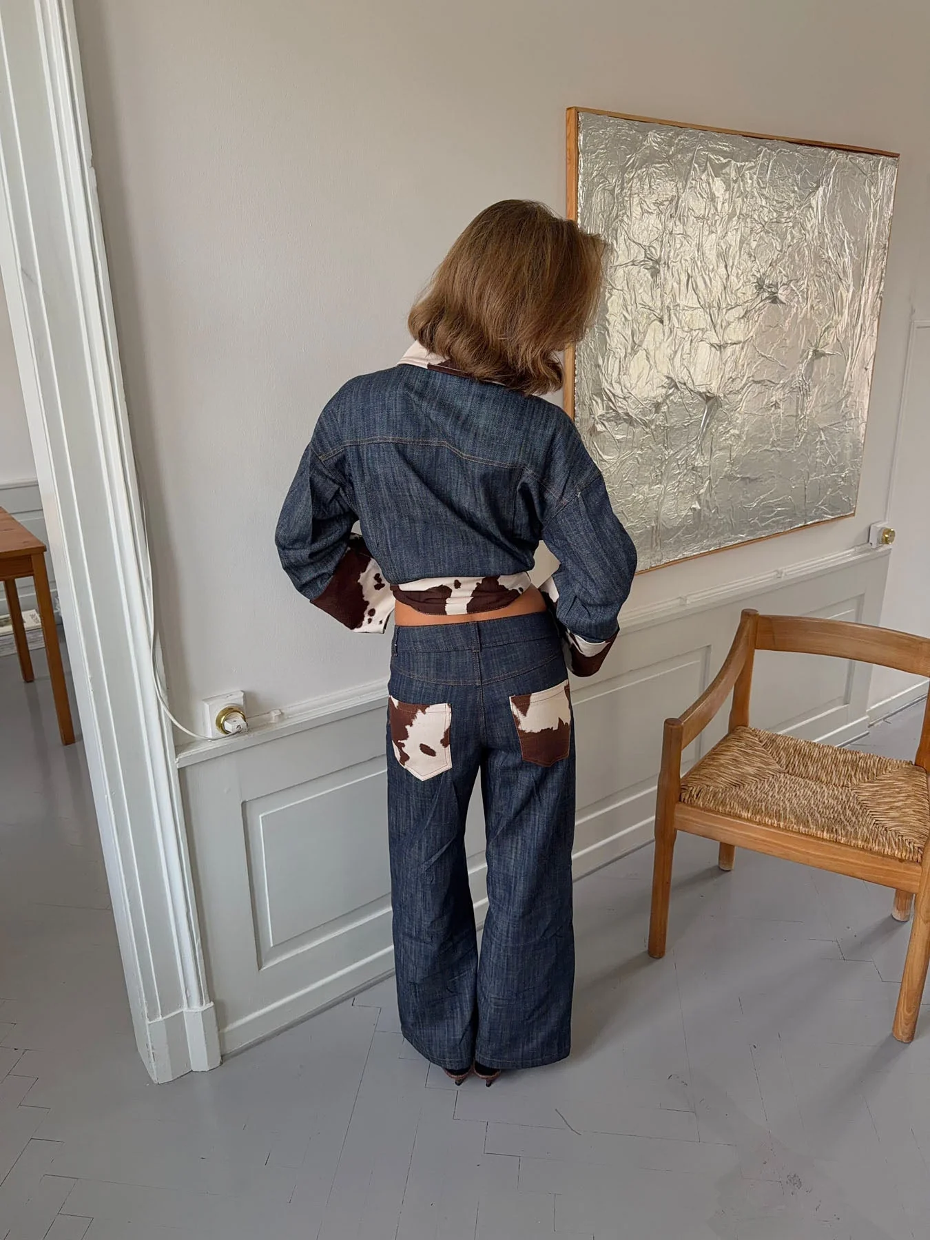 The colorful cow-print detail on the back pockets adds an eye-catching, playful touch.