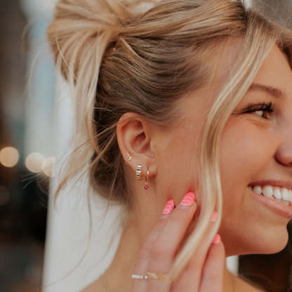 The Tate Cookie Cutter Hoops are the perfect pair of high quality live-in earrings. They are made of hypoallergenic sterling silver or gold vermeil, and are wear and tarnish resistant. Perfect for a single lobe piercing or to stack with other earrings.