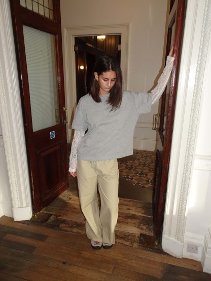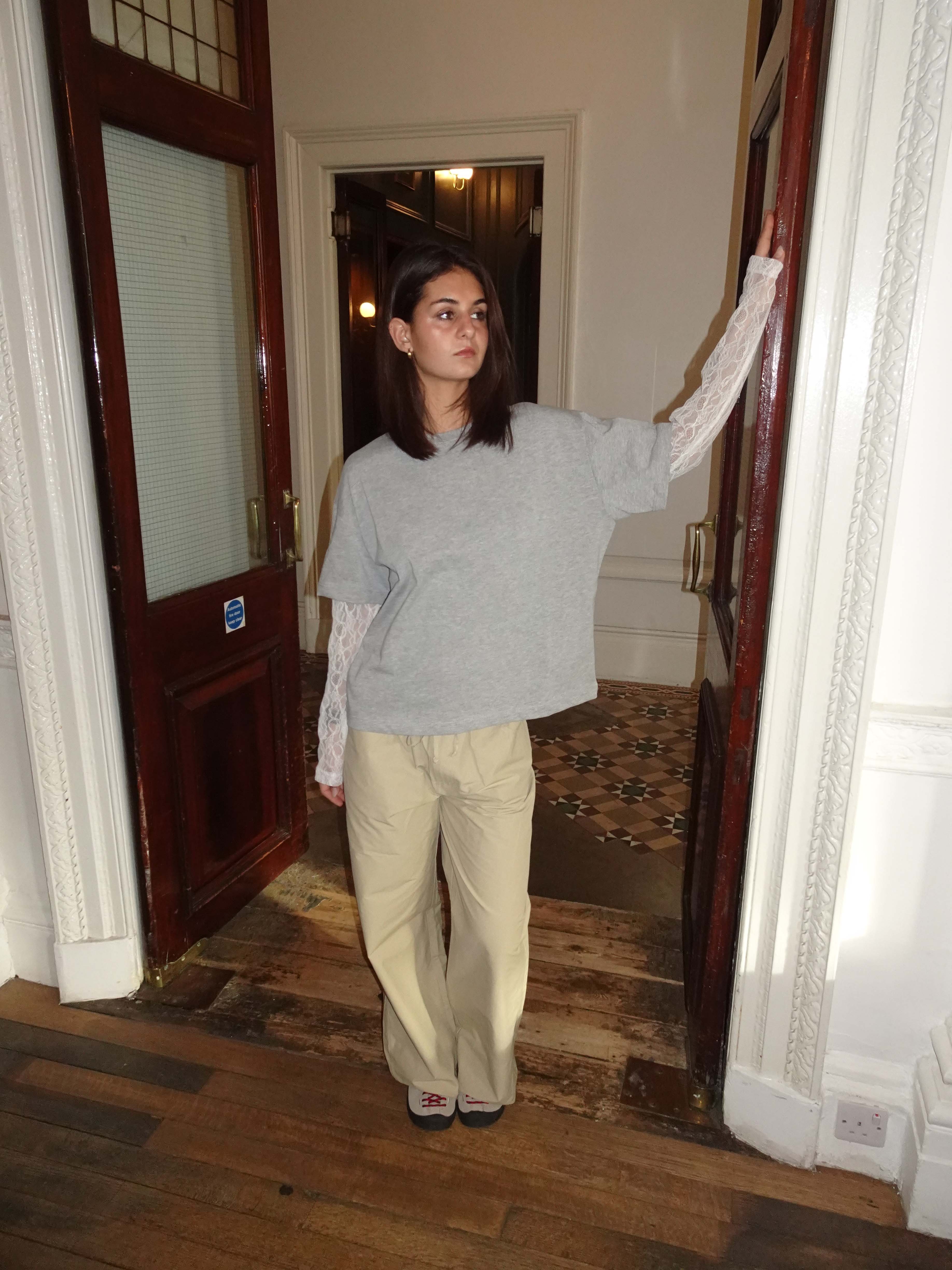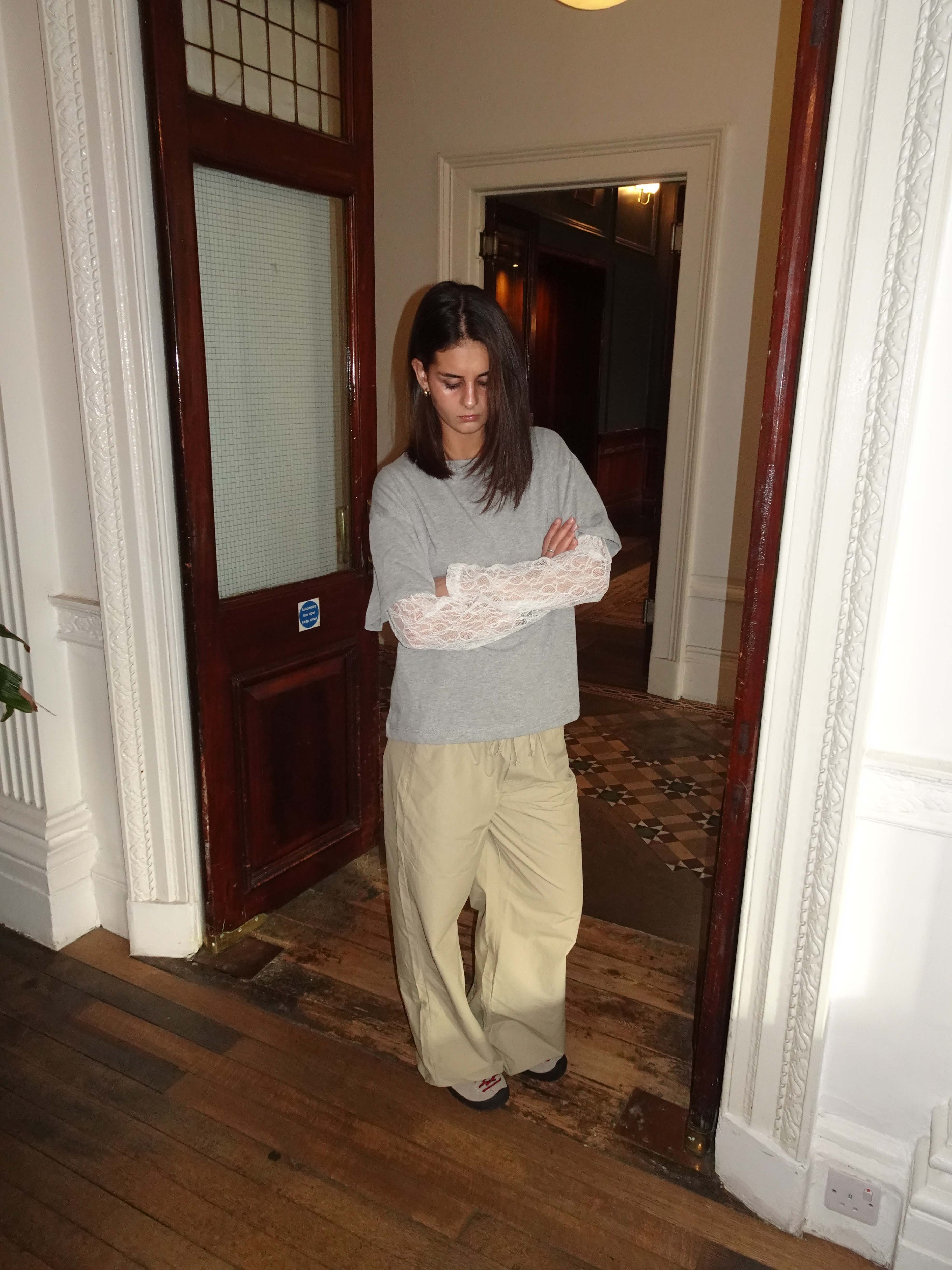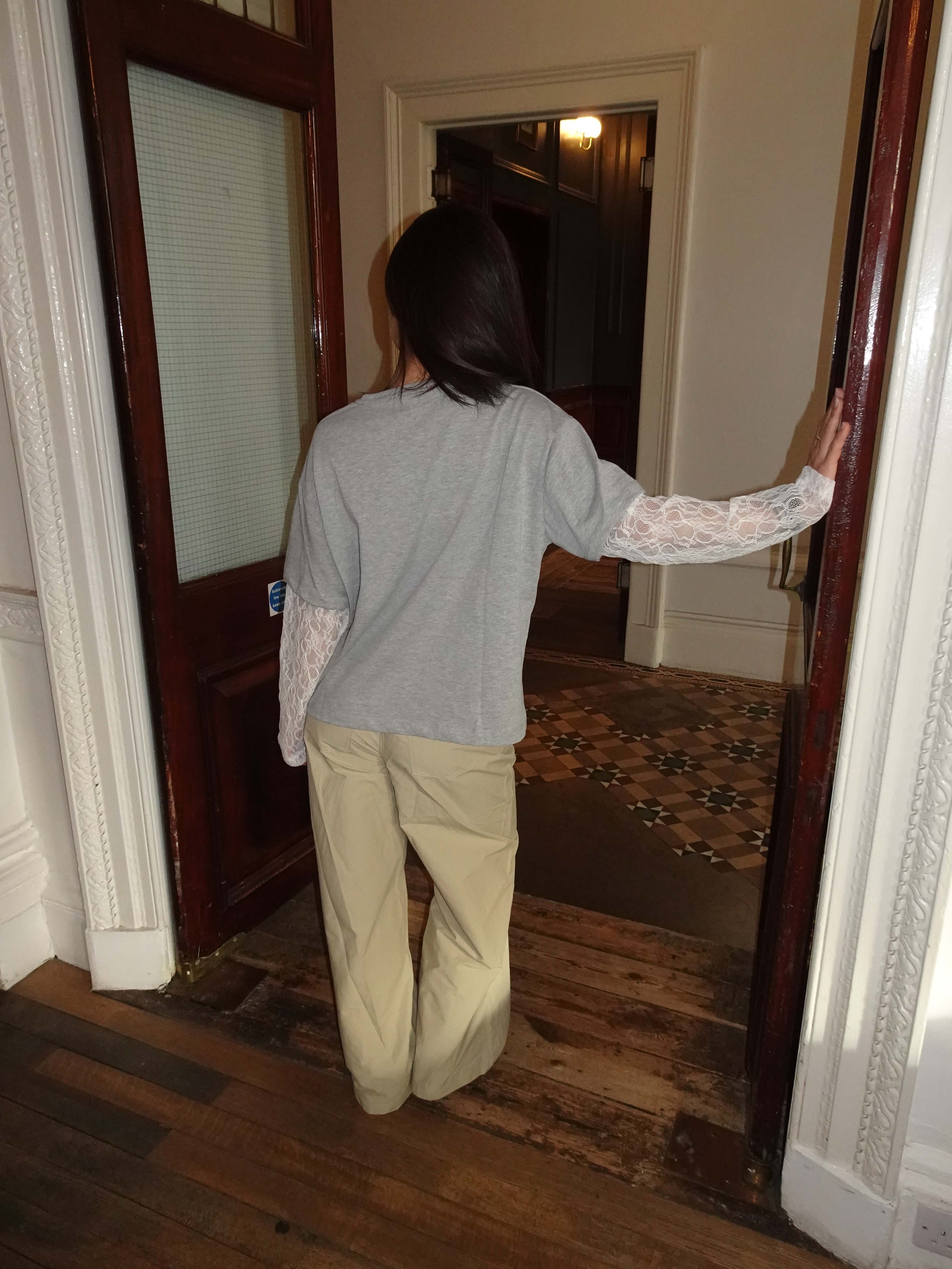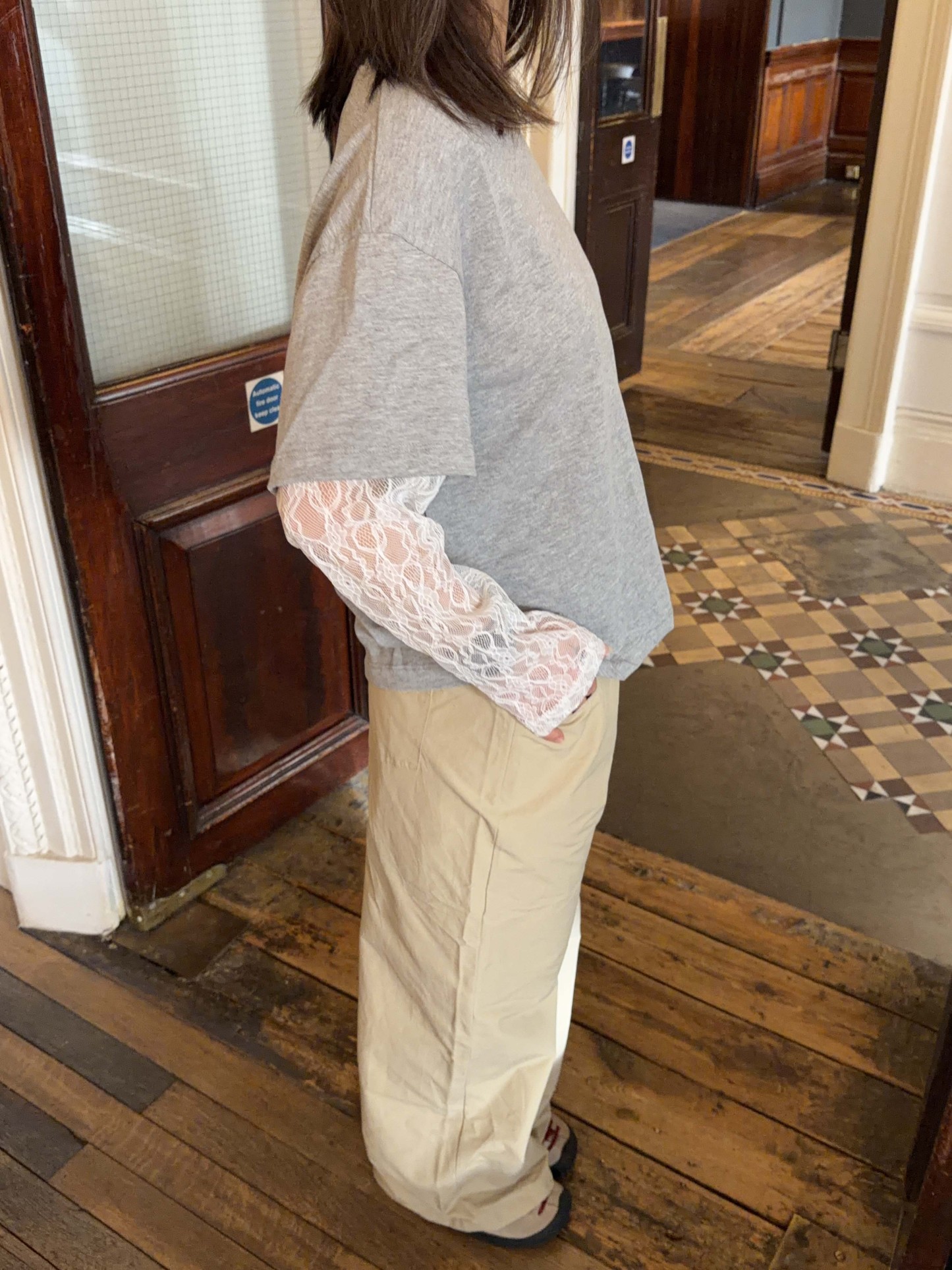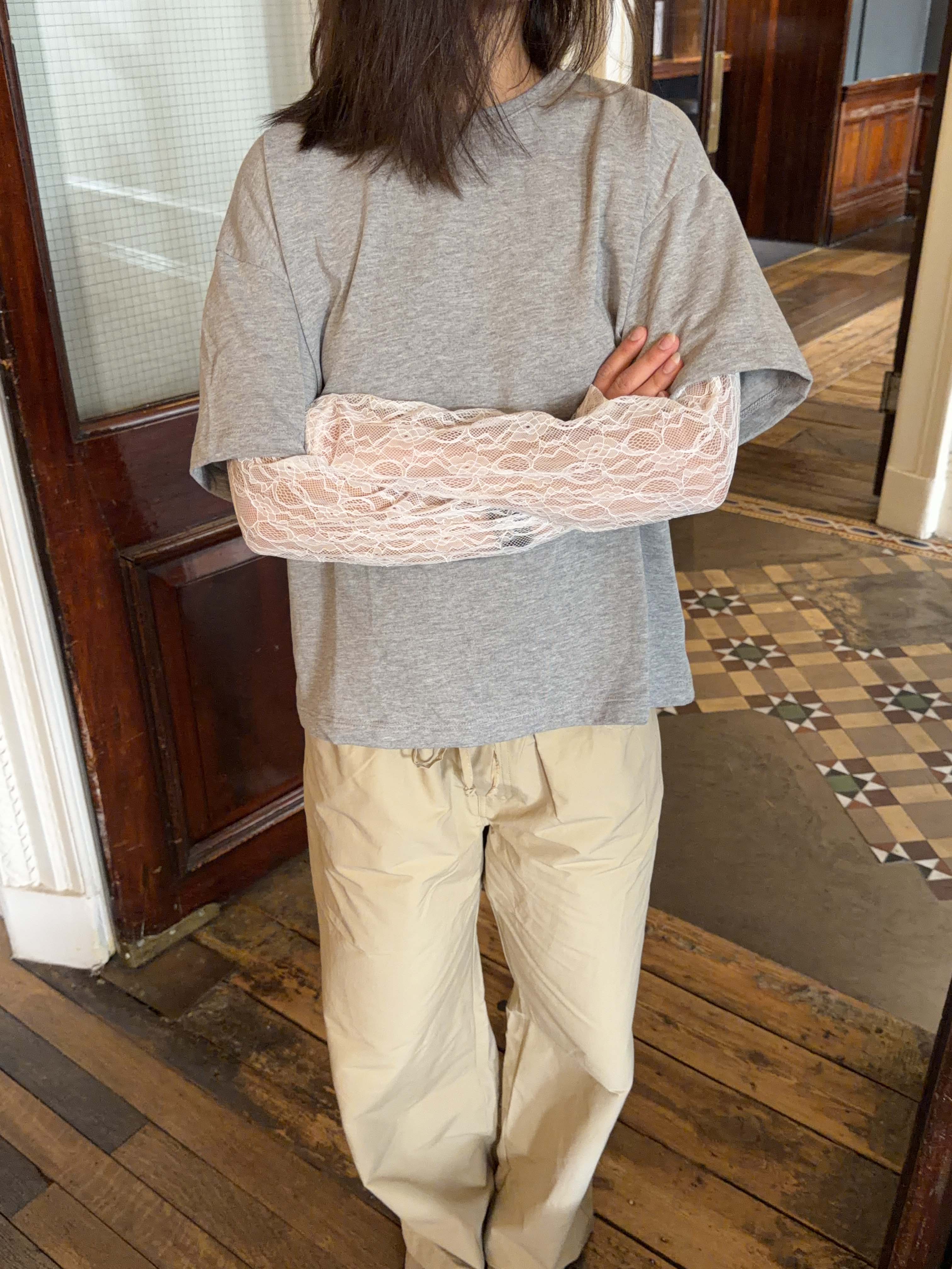 What truly makes this style unique are the long white lace sleeves, which create an elegant and subtly romantic expression. The lace is soft, stretchy, and semi-sheer, giving a lovely contrast to the simple grey body.