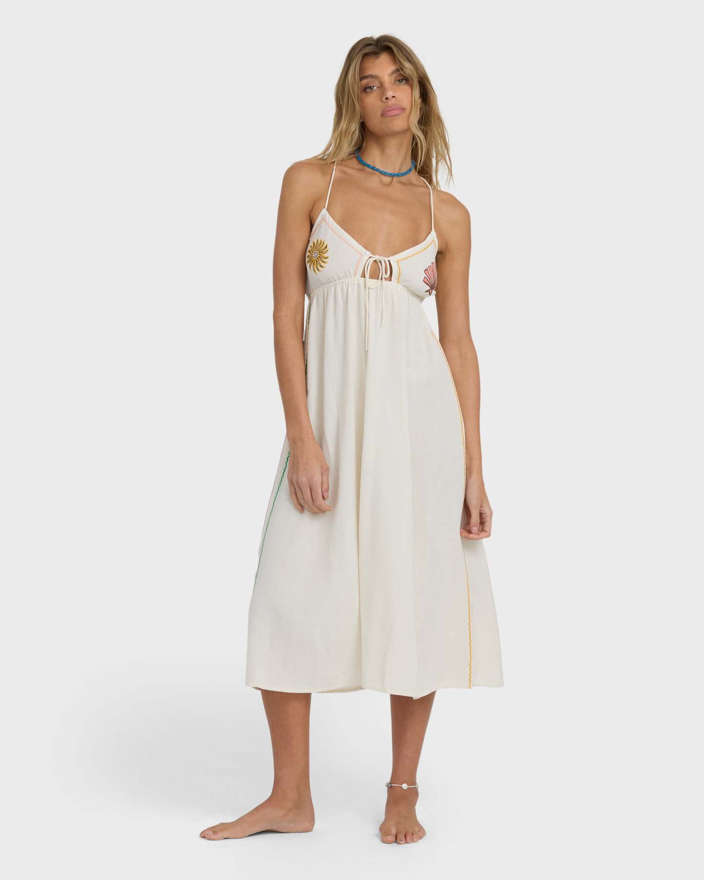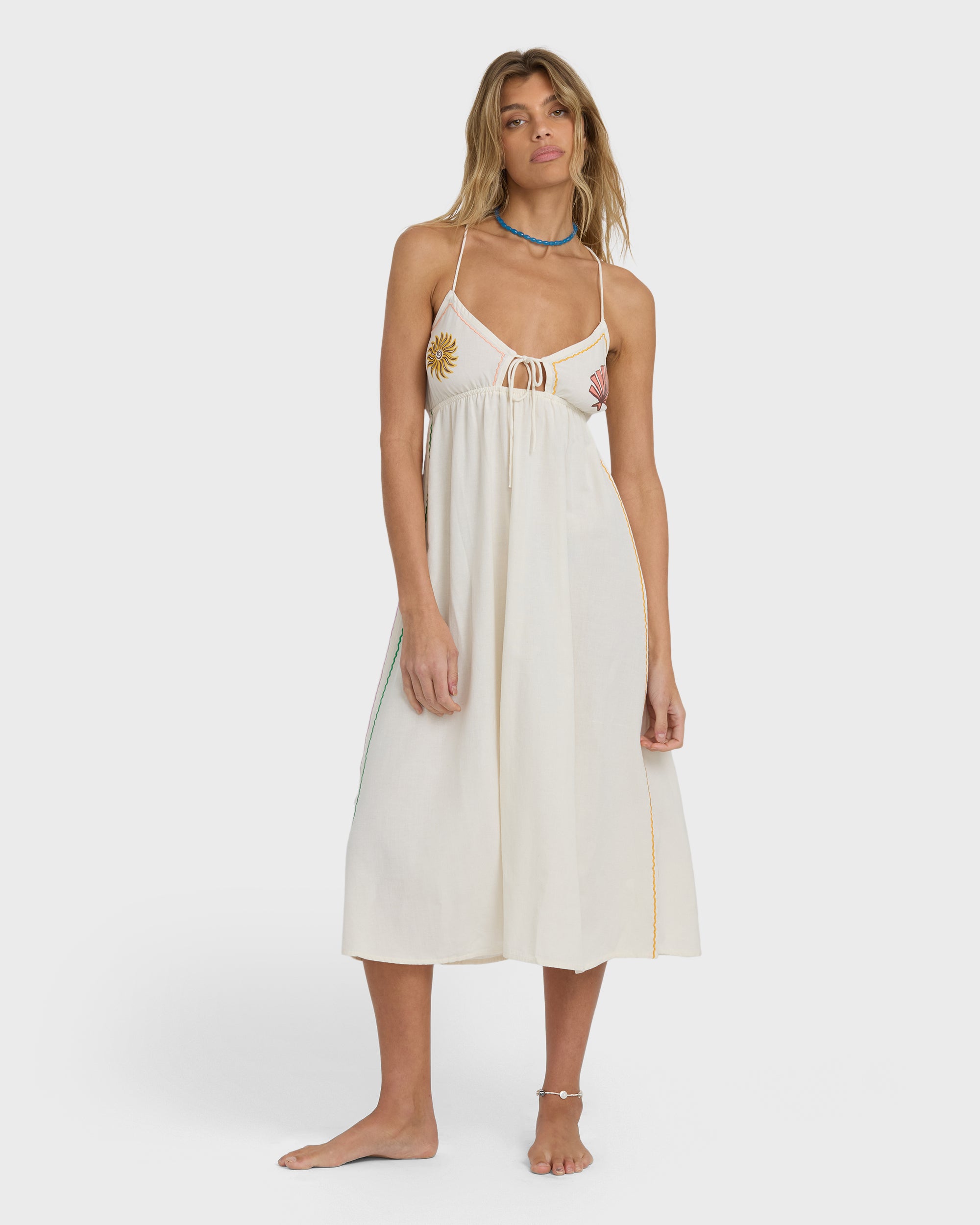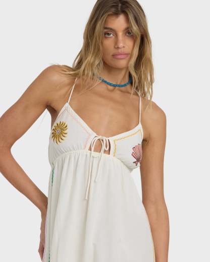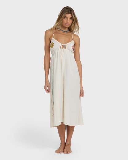 Our Wave Haze Midi Dress brings breezy style with its fitted bodice flowing into an easy skirt. Feminine details shine through decorative embroidery, while a subtle cut-out and placement print add just enough intrigue. Featured here in the White colorway.