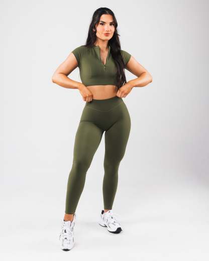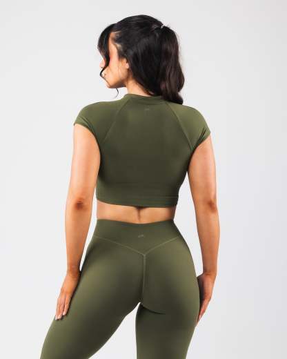 Tenacity is our newest high performance fabric. Extreme high stretch meets a buttery soft hand-feel to make this fabric the perfect ten. These bras allow for unrestricted movement and breathability making them perfect for high intensity training. With a built in bra, and plunging zipper, this bra offers extreme versatility in how it is styled. The cap sleeves and cropped silhouette offer a flattering cut to show off all your hard work.