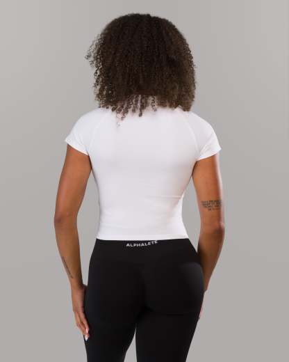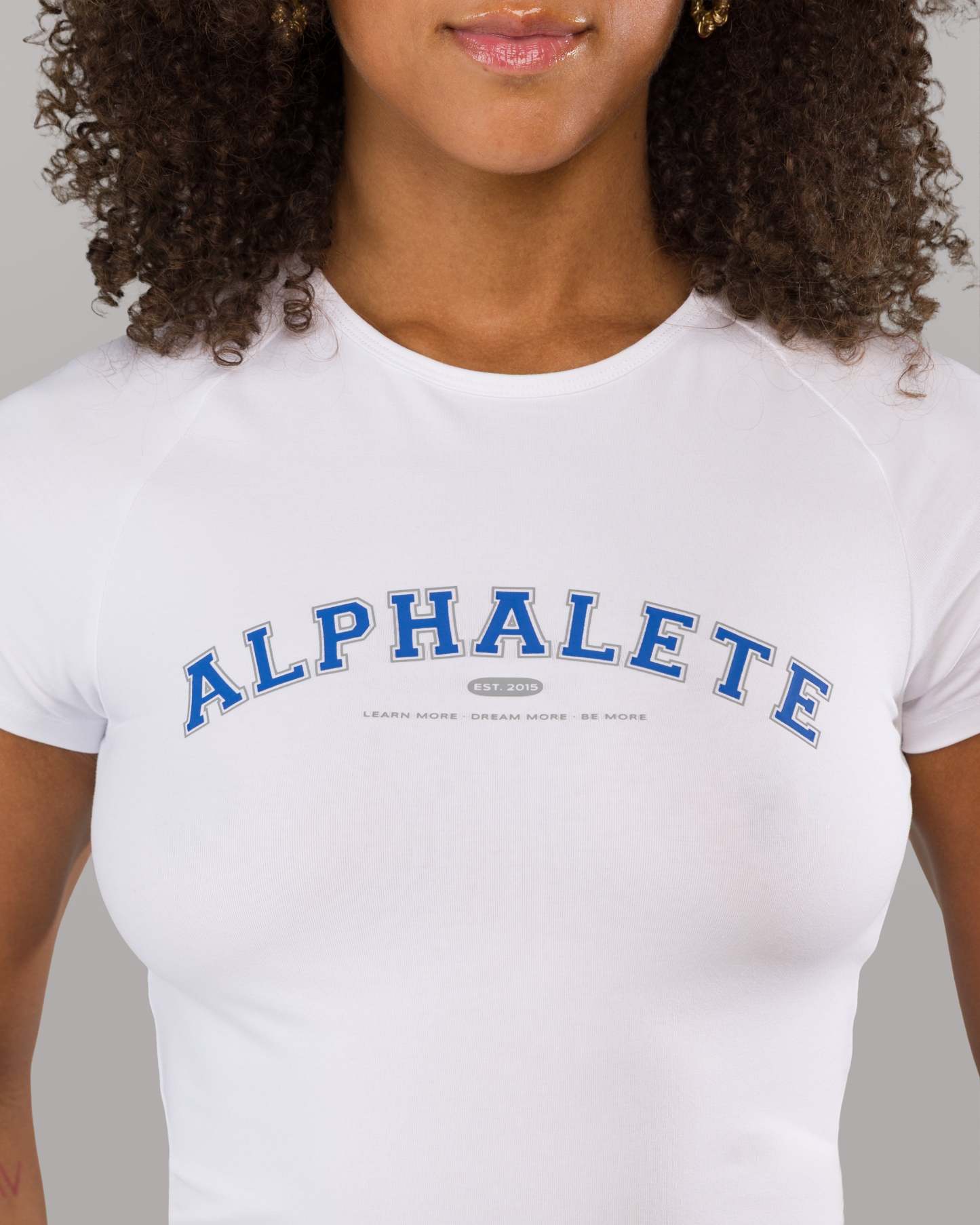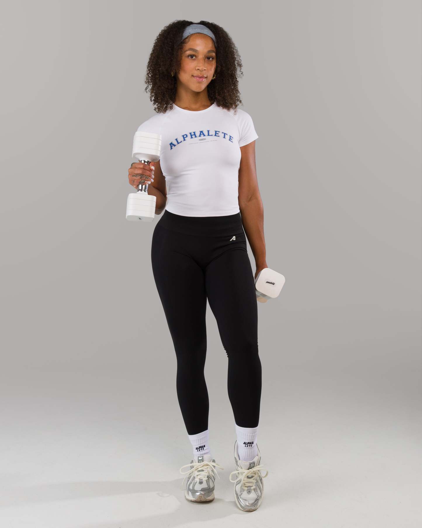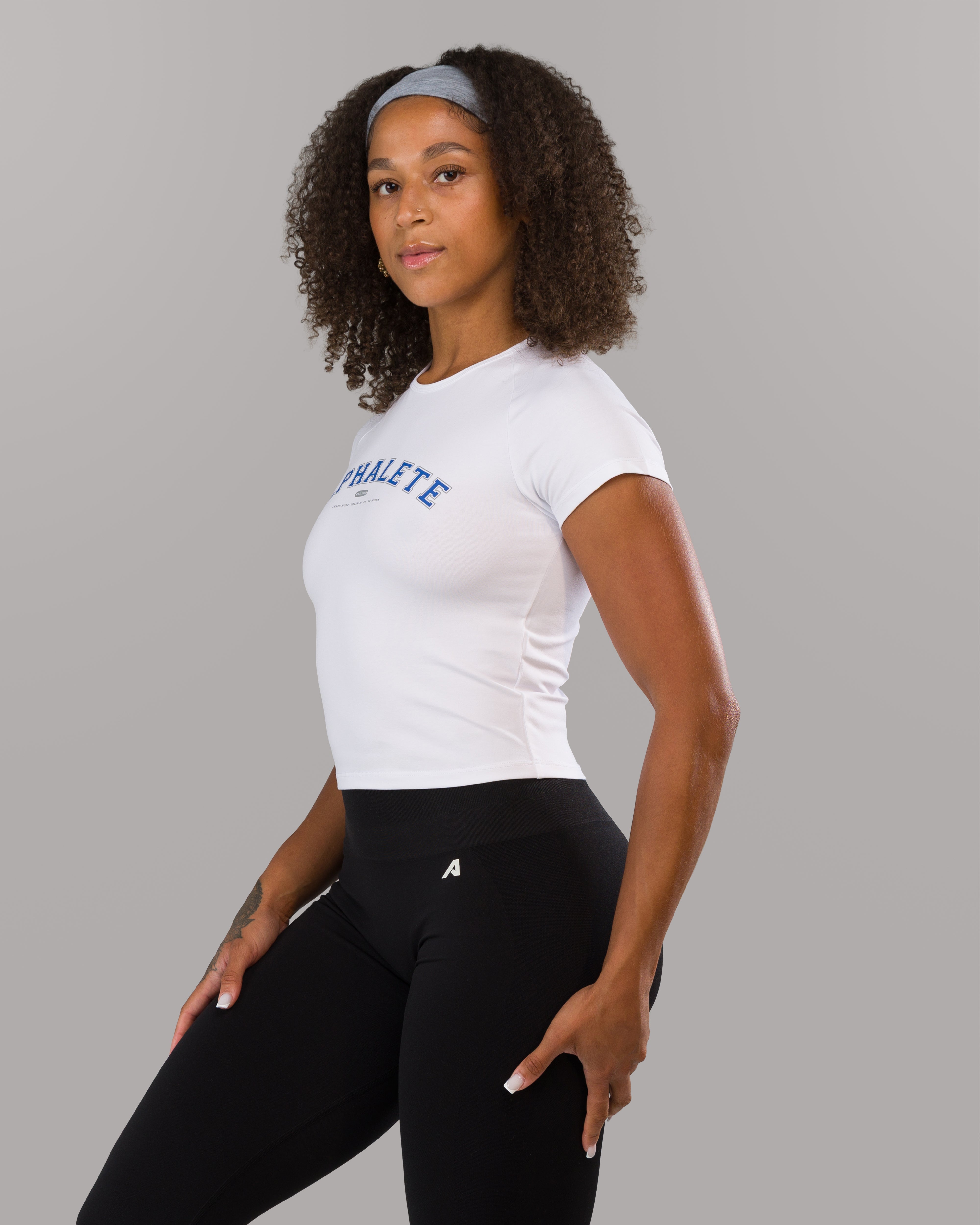 Our Baby Tee features short raglan sleeves and hits just below the natural waist, enhancing your natural curves. Designed with a tight fit and finished with our new varsity graphic, this tee makes a bold statement.